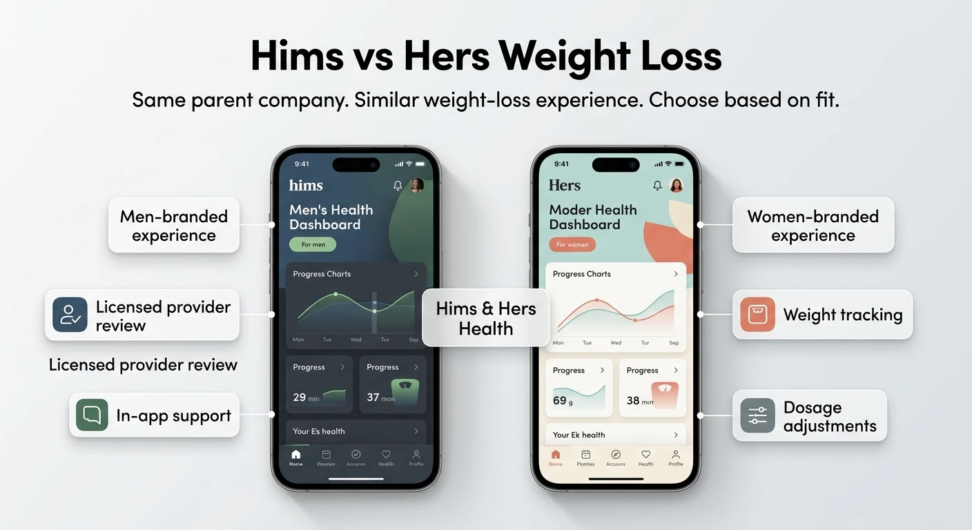 Hims is marketed toward men and Hers toward women. The current public weight loss offer is the same across both brands. The practical choice is which brand experience you prefer — go to whichever feels right.