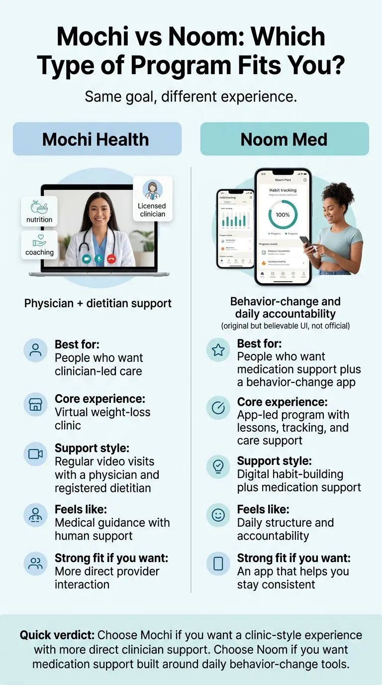 Mochi = physician + dietitian + video visits. Noom = app-led behavior change + medication support. Same FDA-approved goal, completely different experience.