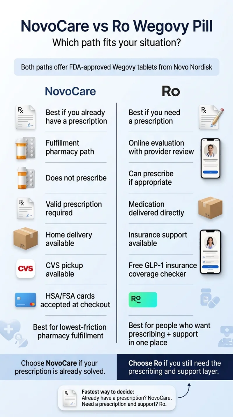 NovoCare = pharmacy fulfillment path. Ro = prescribing + pharmacy + clinical support. Both dispense FDA-approved Wegovy tablets from Novo Nordisk.