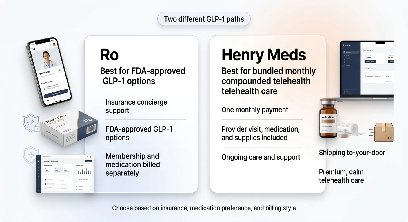 In 2026, Ro and Henry Meds have diverged significantly. Ro is an insurance-supported, FDA-approved GLP-1 platform. Henry Meds is a bundled cash-pay compounded GLP-1 provider. The comparison is less 'which is the better version of the same thing?' and more 'which lane fits your situation?'