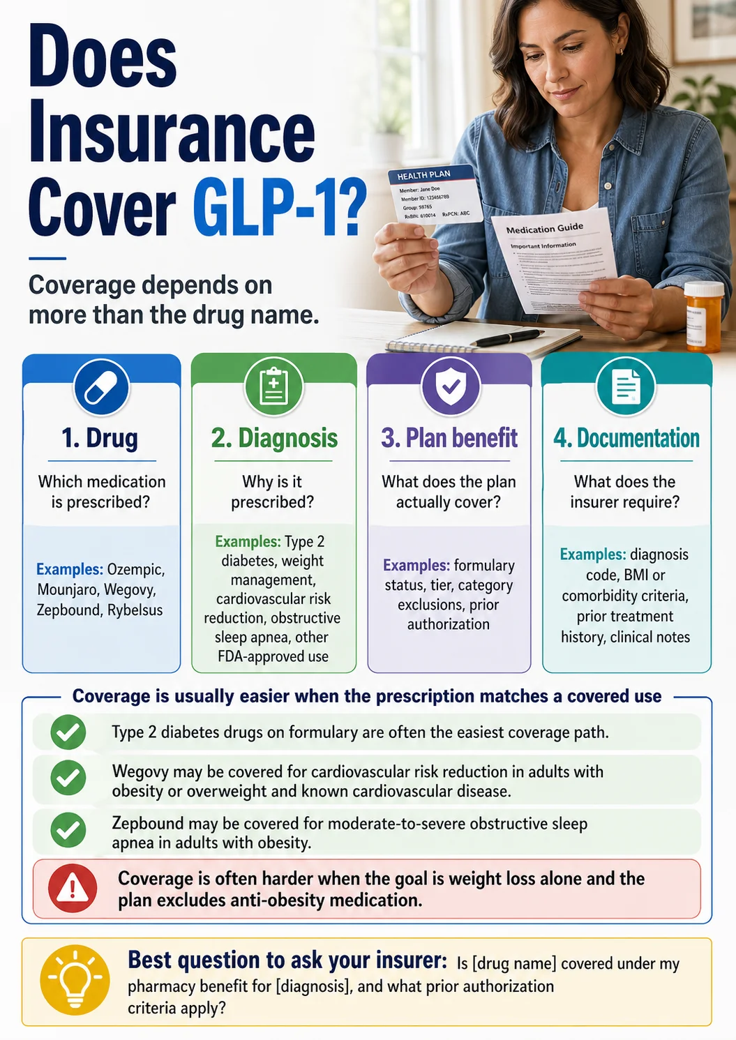 The drugs most likely to be covered depend on the diagnosis, not the brand alone. Diabetes-labeled GLP-1s tend to be covered for type 2 diabetes. Obesity-labeled drugs tend to be covered only when the plan includes anti-obesity medications, or when the prescription matches a non-weight-loss FDA-approved use.