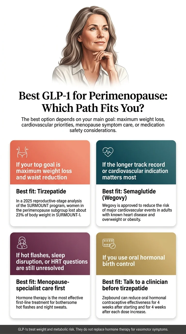 Zepbound (tirzepatide) is the strongest option for most eligible perimenopausal women when the primary goal is maximum weight loss and waist reduction. The SURMOUNT trials showed approximately 20–23% body weight loss in perimenopausal women. Wegovy (semaglutide) is the better choice if cardiovascular risk reduction or broader insurance coverage is the priority.