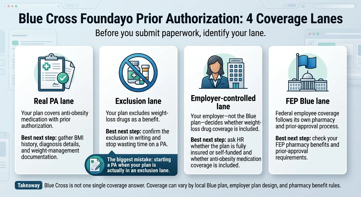 Blue Cross Foundayo prior authorization only works if your specific BCBS plan still covers weight-loss GLP-1s — and not every Blue plan does in 2026. Some Blue plans show a real PA path (Excellus BCBS names Foundayo in its weight-management policy). Some Blue plans explicitly excluded weight-loss GLP-1s for 2026 (BCBS Massachusetts Focused Formulary members; Independence Blue Cross fully-insured commercial members). And some plans use the Blue Cross logo but set their own drug coverage rules as self-funded employer plans, meaning your HR team — not the insurer — controls the answer.