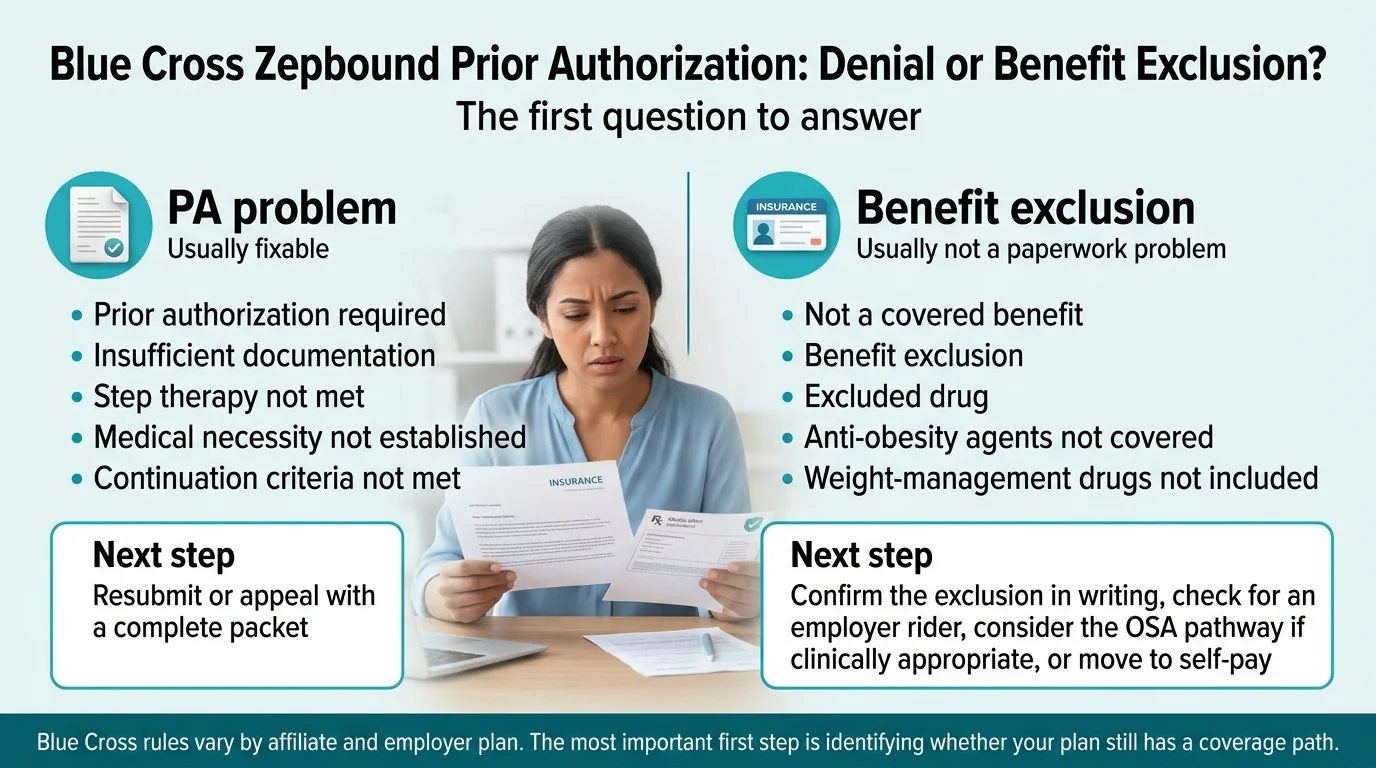 Answer capsule: A prior authorization denial means your insurer is still evaluating Zepbound but thinks your packet is missing required evidence — fixable with better documentation. A benefit exclusion means the plan design itself does not cover the drug category, and several major Blue Cross plans explicitly say exclusions cannot be appealed. You need to tell these apart before you do anything else, because the wrong move wastes weeks.
