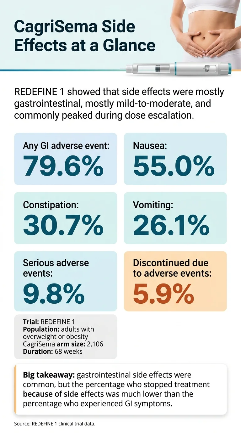 CagriSema side effects are overwhelmingly gastrointestinal — nausea, constipation, vomiting, diarrhea, abdominal pain — and most were mild-to-moderate and transient in the REDEFINE phase 3 trials. In REDEFINE 1, 79.6% of participants on CagriSema had at least one gastrointestinal adverse event versus 39.9% on placebo. Nausea hit 55%. Constipation 30.7%. Vomiting 26.1%. About 1 in 17 people (5.9%) discontinued treatment because of side effects.