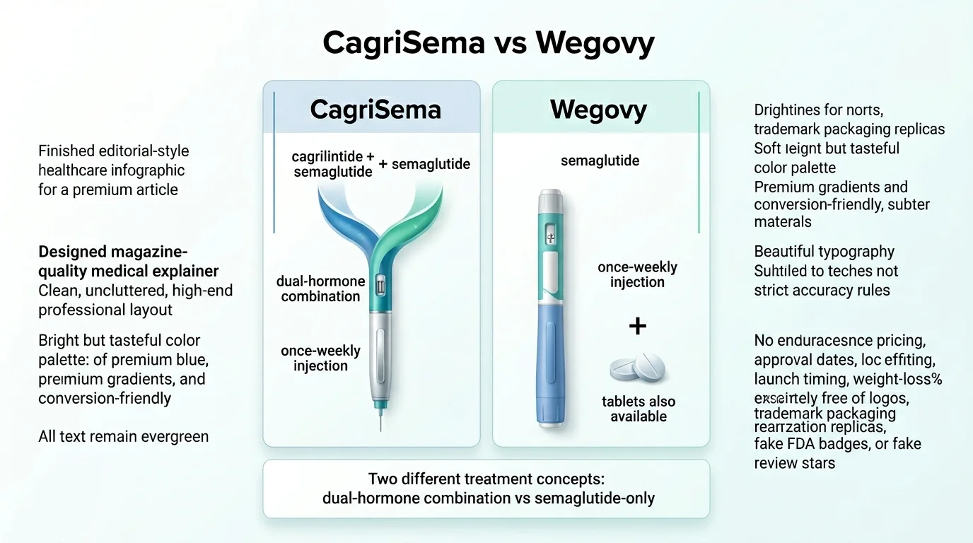 CagriSema vs Wegovy: dual-hormone combination vs semaglutide-only. CagriSema is not FDA-approved as of April 2026.