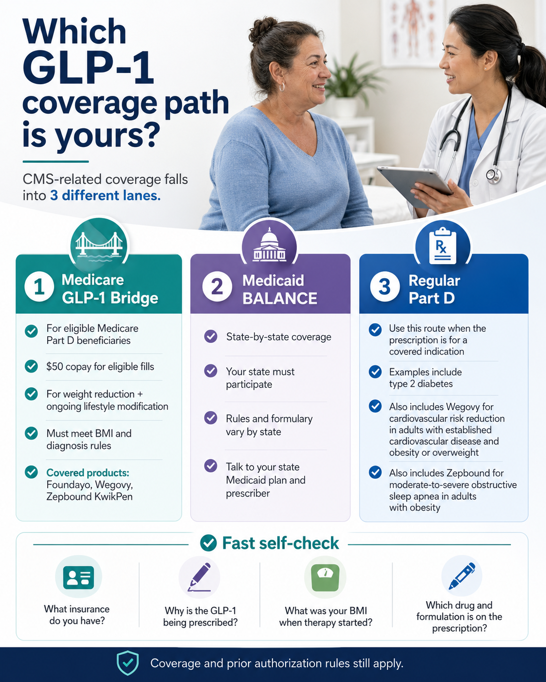CMS BALANCE Model GLP-1 eligibility isn’t one rule. It’s three. If you’re on Medicare, the live path through 2027 is the GLP-1 Bridge — $50 a month for Wegovy, Zepbound KwikPen, or Foundayo if you meet the BMI and diagnosis criteria below. If you’re on Medicaid, coverage depends on whether your state opts in to BALANCE between May 2026 and January 2027. And if your GLP-1 is being prescribed for diabetes, cardiovascular risk, or sleep apnea, that may be a regular Part D route through your existing plan.