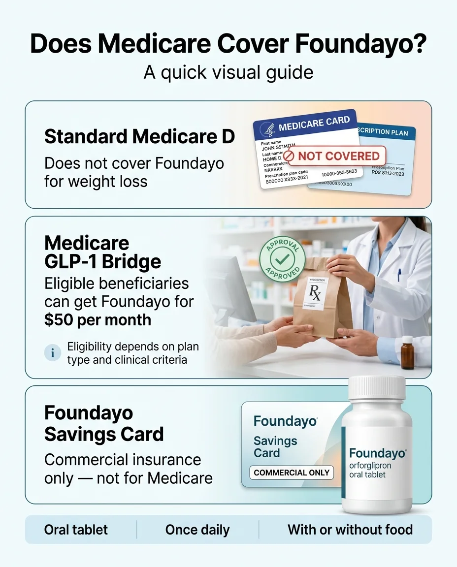 | Foundayo Savings Card | $25 | Commercial insurance only — not Medicare | Available now |