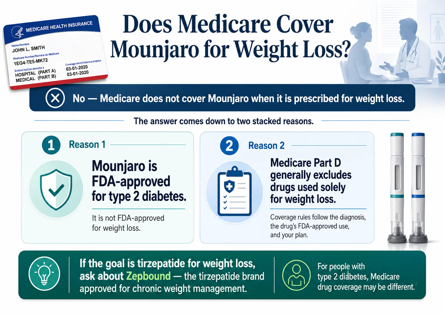 Most Medicare-Mounjaro questions come down to the same distinction: Mounjaro is the diabetes brand of tirzepatide, Zepbound is the weight-loss brand. Medicare follows the FDA indication on each label, the diagnosis on your prescription, and your plan's formulary. If your goal is weight loss on Medicare, the right question is almost always “Does Medicare cover Zepbound?” not “Does Medicare cover Mounjaro?”