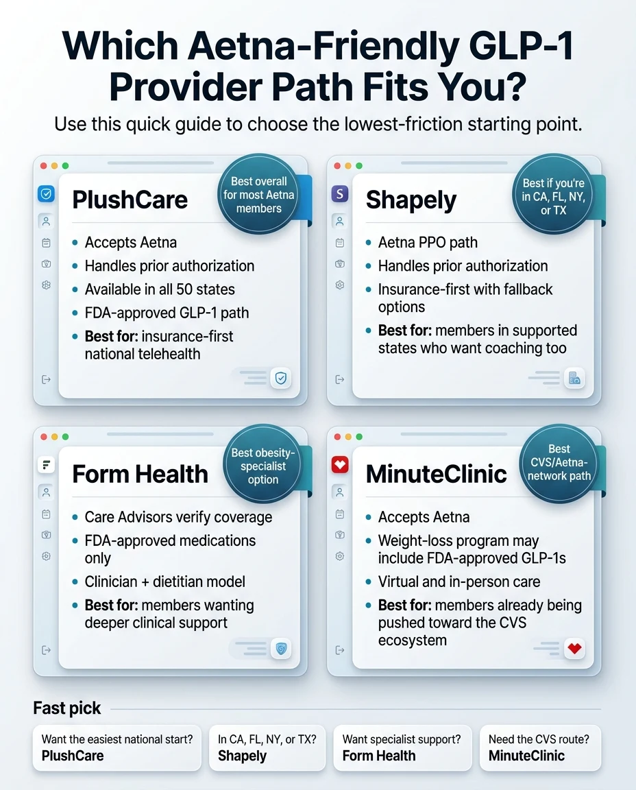 PlushCare is the safest national starting point for Aetna members who want an FDA-approved GLP-1 through insurance. It's in-network with Aetna, prescribes brand-name GLP-1 medications including Wegovy, Zepbound, Ozempic, and Mounjaro, and its weight-loss prior-authorization decisions average 7–14 business days.