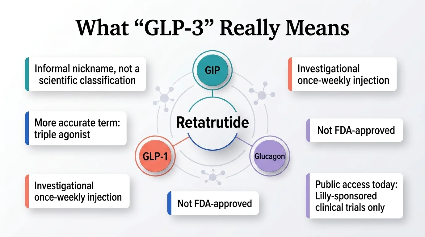 No. "GLP-3" is a scientifically inaccurate nickname, not a formal classification. Eli Lilly says the nickname arose because retatrutide targets three receptors — GLP-1, GIP, and glucagon — not because "GLP-3" is a recognized scientific class. The accurate description is "triple hormone receptor agonist."