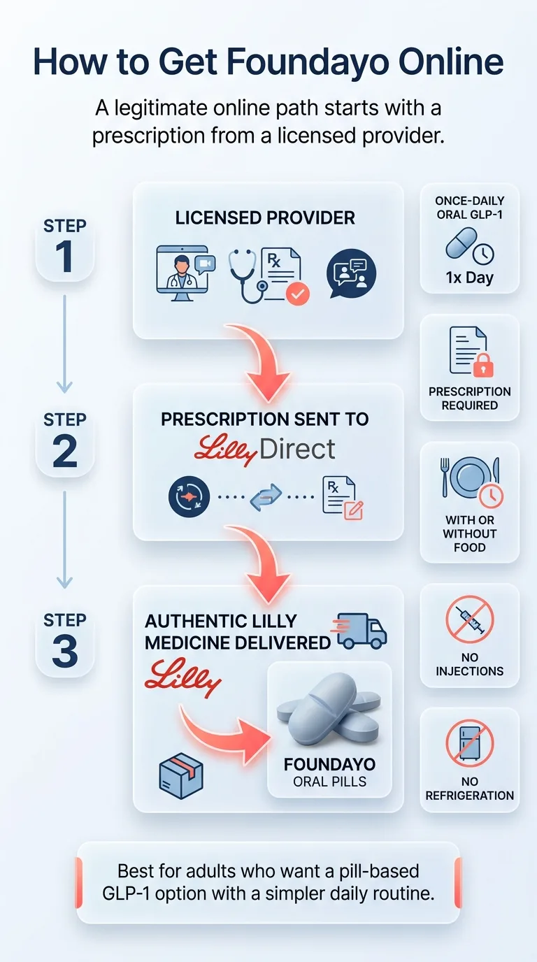 Here is how to get Foundayo online right now: get a valid prescription from a licensed provider — your doctor or a telehealth clinician — and fill it through LillyDirect, Eli Lilly's official access platform. Self-pay starts at $149/month for the lowest dose. Eligible patients with commercial insurance and the Foundayo savings card may pay as little as $25/month.