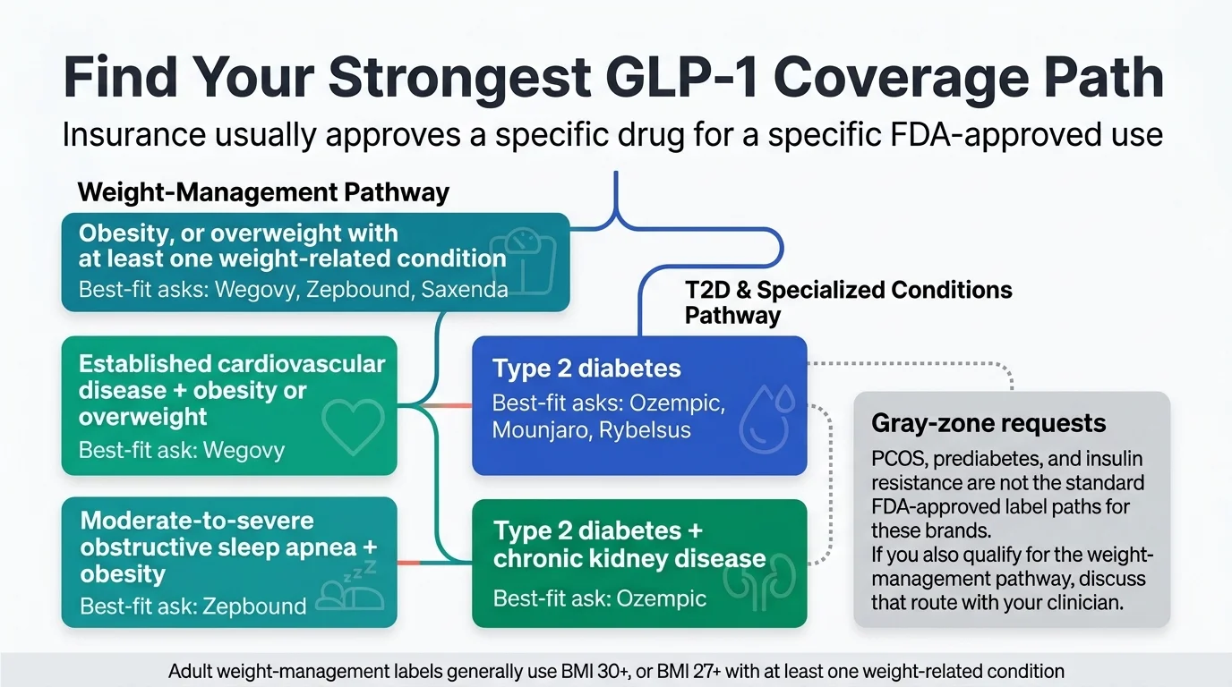 PCOS is not a standalone FDA-approved indication for any GLP-1 medication. However, many people with PCOS also have a BMI that qualifies under the obesity/overweight pathway, or have insulin resistance, prediabetes, or other comorbidities that open another coverage door. Work with your doctor to identify the strongest qualifying pathway based on your full clinical picture.