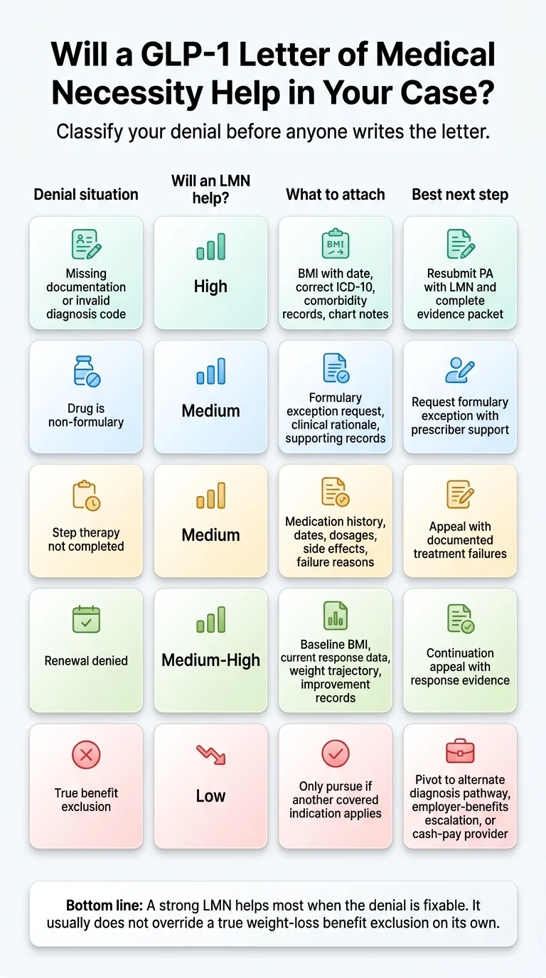 Your doctor writes a letter of medical necessity (LMN) for a GLP-1 — not you. But whether that letter actually gets your GLP-1 covered depends almost entirely on what goes into it, what records are attached, and whether your denial is even the kind a letter can fix. Most GLP-1 letters of medical necessity fail not because the patient doesn’t qualify, but because the letter doesn’t match the insurer’s exact criteria — or because the real problem is a benefit exclusion that no letter can override.