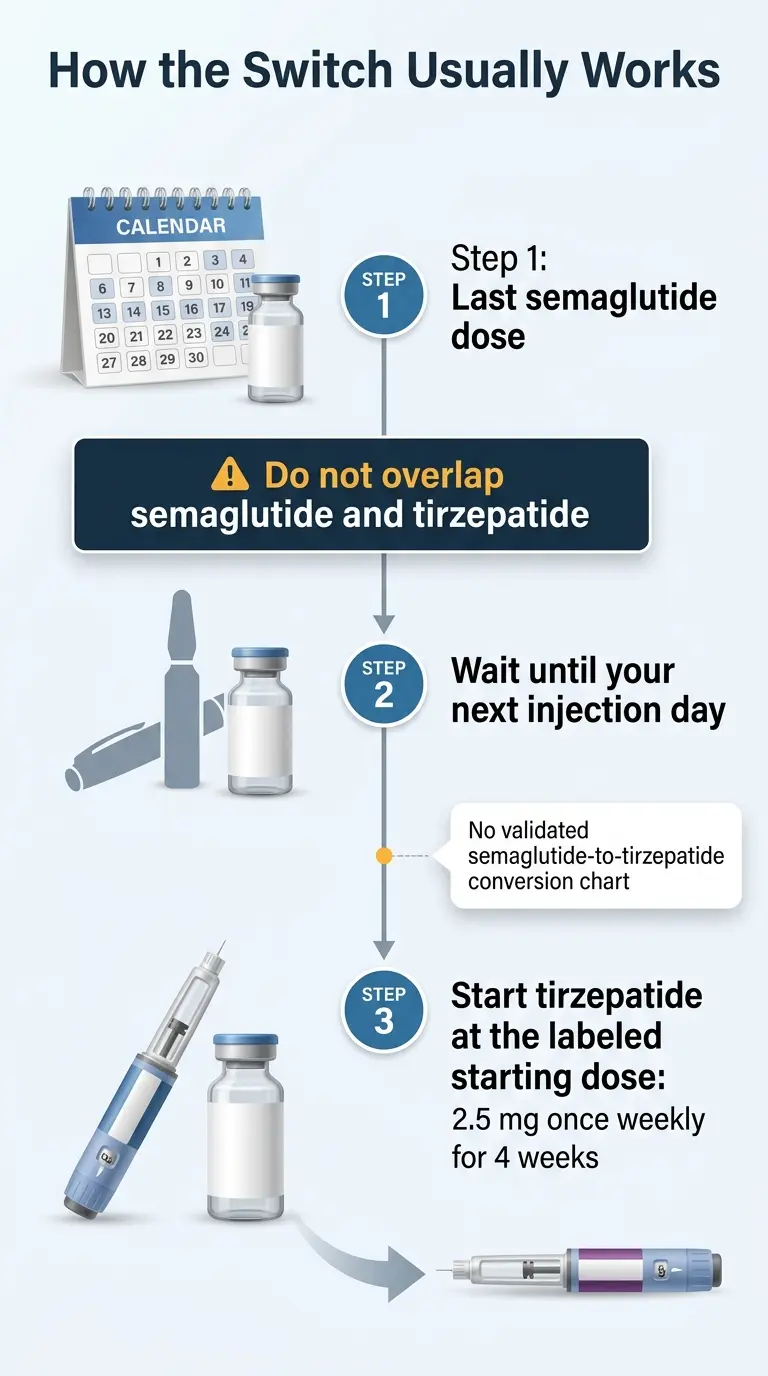 The clinician-guided approach is straightforward: take your last semaglutide injection as scheduled, wait about 7 days (your normal injection day), and start tirzepatide at 2.5 mg under a prescriber’s guidance. Do not overlap the two medications. There is no validated dose conversion chart — any website offering one is giving you false precision that could actually hurt you.