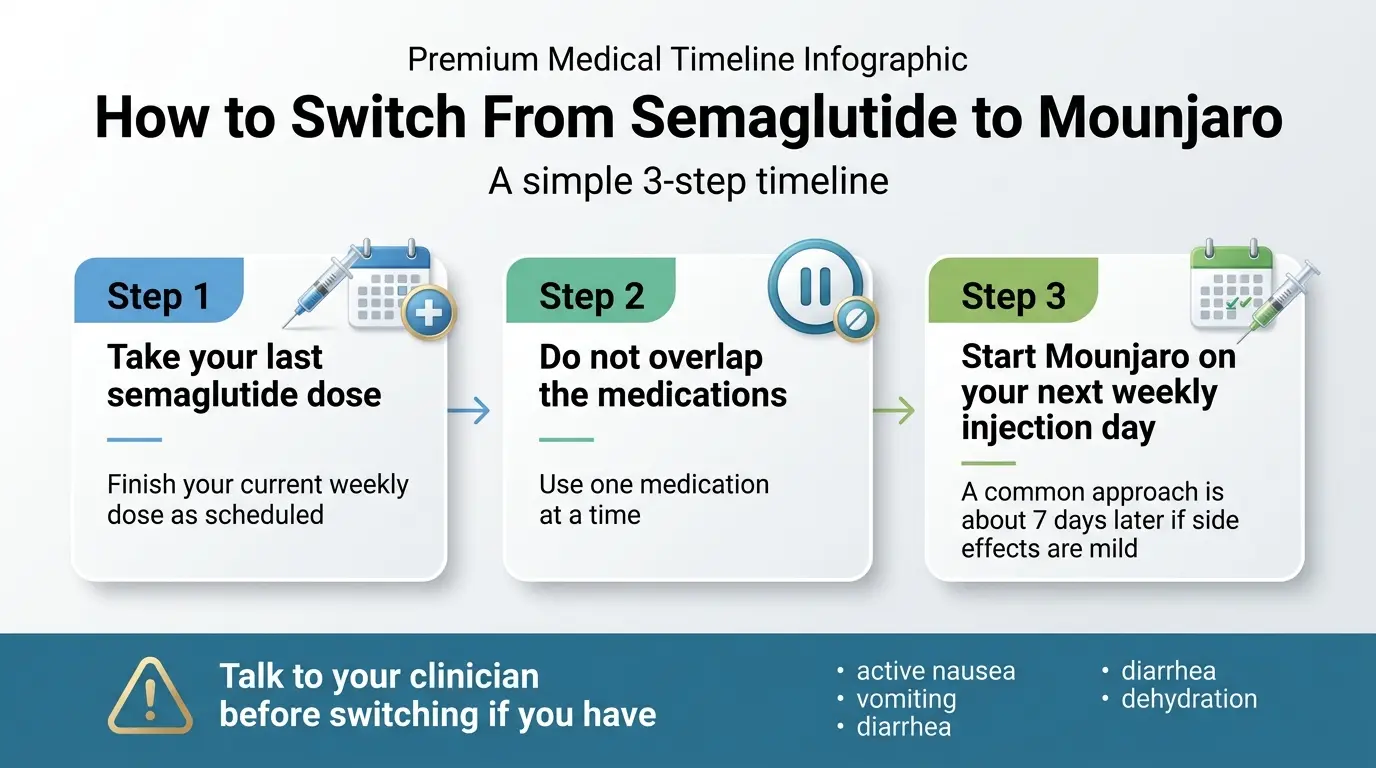 The switch follows three steps: finish semaglutide, wait for your next injection day, and start Mounjaro at 2.5 mg. There is no validated conversion chart, and you should not take both medications at the same time.