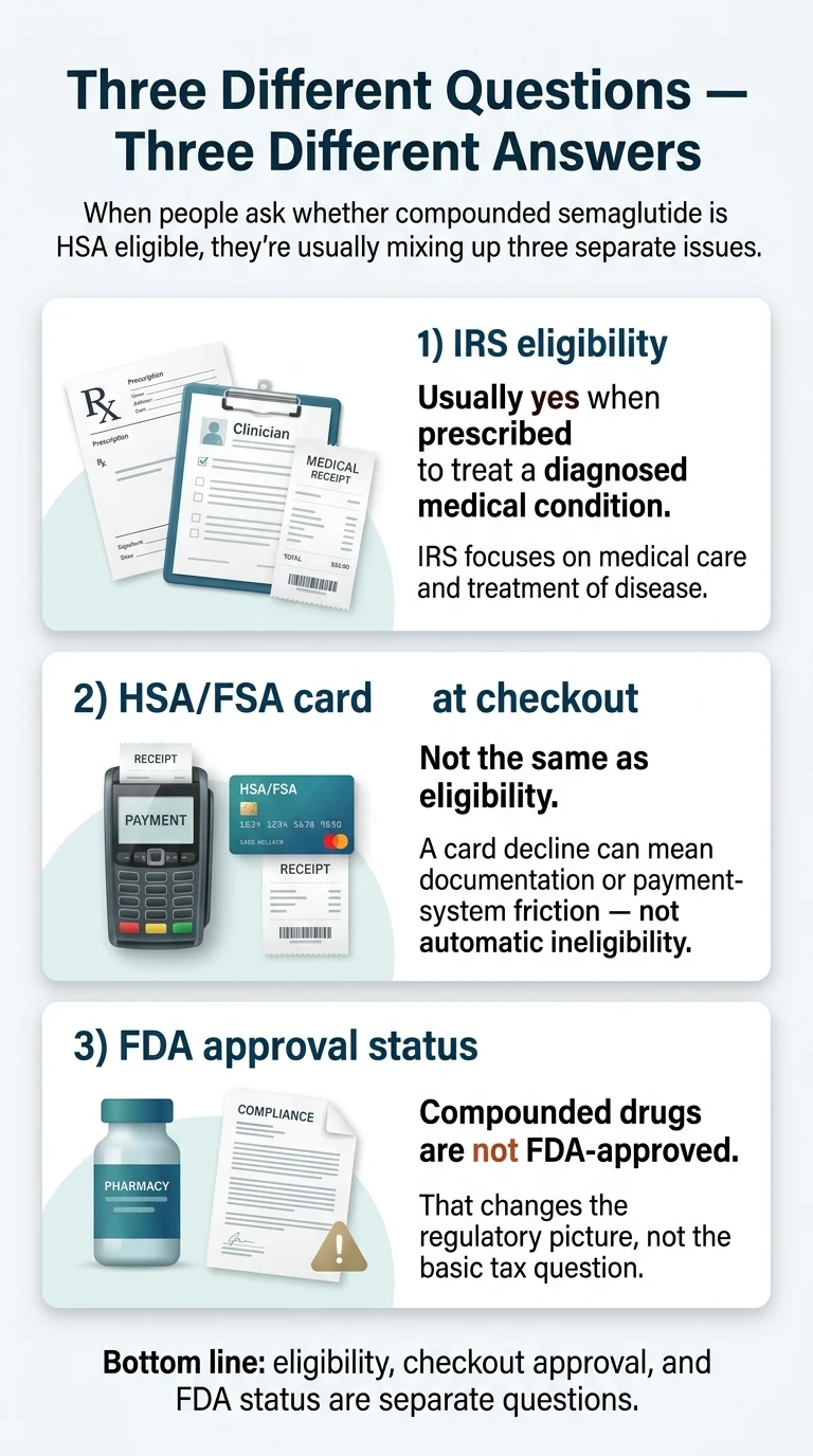 When readers type “is compounded semaglutide HSA eligible,” they’re really asking three separate questions — and the answer changes depending on which one they mean. IRS eligibility, checkout card acceptance, and FDA compounding status are governed by three different authorities and have three different answers.