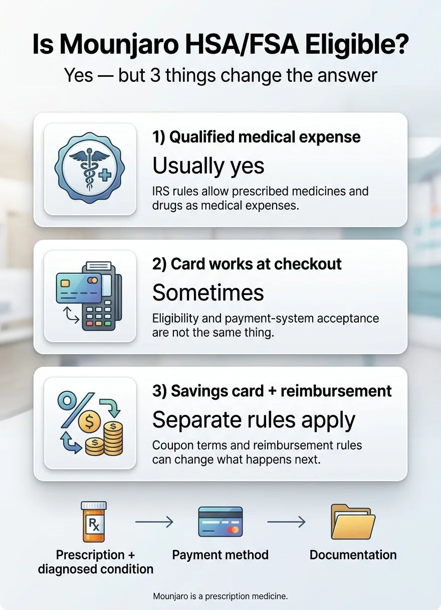 Usually yes. Mounjaro is HSA-eligible because the IRS treats prescribed medicines as qualified medical expenses when they treat a diagnosed medical condition. The practical answer can shift based on checkout acceptance, off-label documentation requirements, and Savings Card rules.