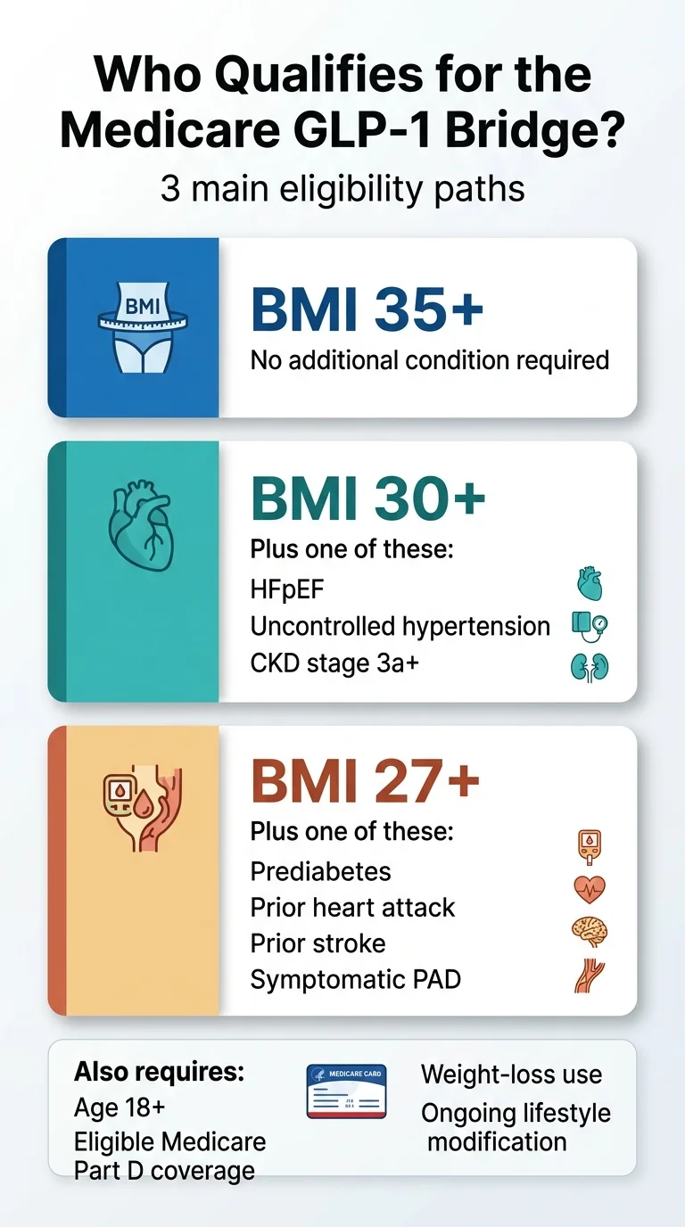 This is the simplest path. If your Body Mass Index is 35 or above at the time you start GLP-1 therapy, you qualify with no additional diagnosis required.