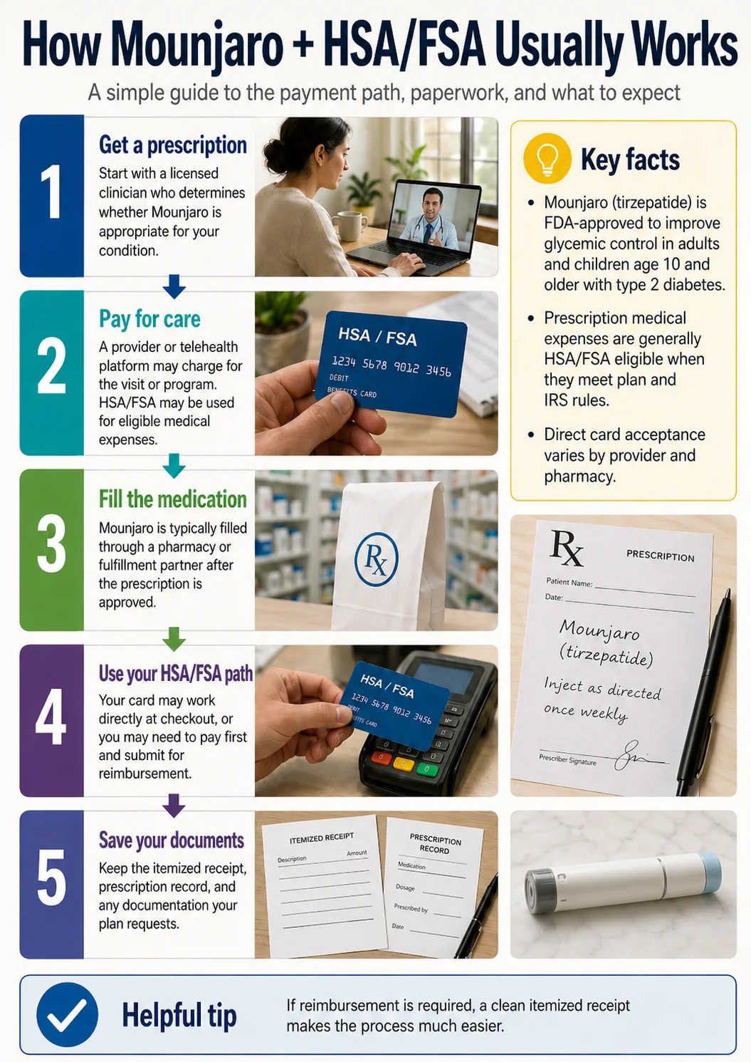 You pay with a personal card, the provider gives you a clean itemized receipt, and you submit the receipt to your HSA/FSA administrator. This is the most common Mounjaro telehealth path. It works — it just isn't card-at-checkout convenience.