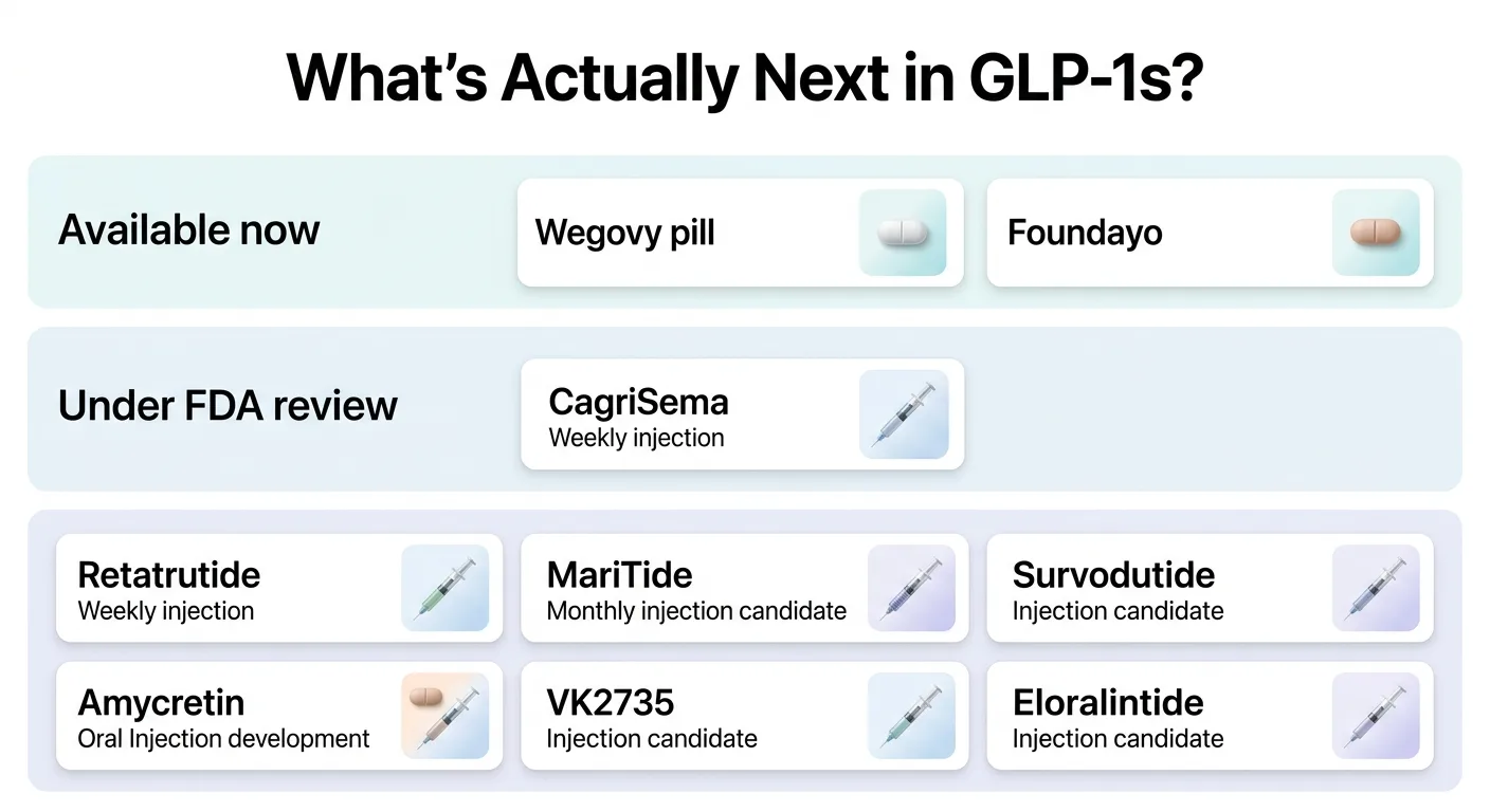 The main next-generation GLP-1 drugs in development or newly approved are: the Wegovy pill (approved December 2025), Wegovy HD (approved March 2026), Foundayo/orforglipron (approved April 2026), CagriSema (under FDA review since December 2025), retatrutide (Phase 3), MariTide (Phase 3), amycretin (Phase 3 starting Q1 2026), survodutide (Phase 3), eloralintide (Phase 3 advancing), and VK2735 (SC in Phase 3, oral earlier-phase). Three are available now; one is under review; the rest are 18+ months away based on current trial stage.