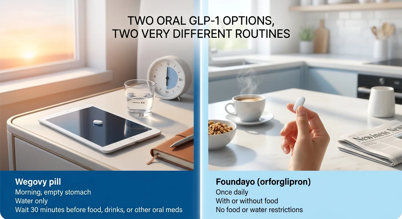 But — and this matters — Wegovy pill demands a strict empty-stomach morning routine that will genuinely wreck some people's consistency. If your mornings are chaotic, you take other morning meds, or you know strict medication timing has failed you before, Foundayo's take-it-anytime flexibility isn't a minor perk. It's the whole point.