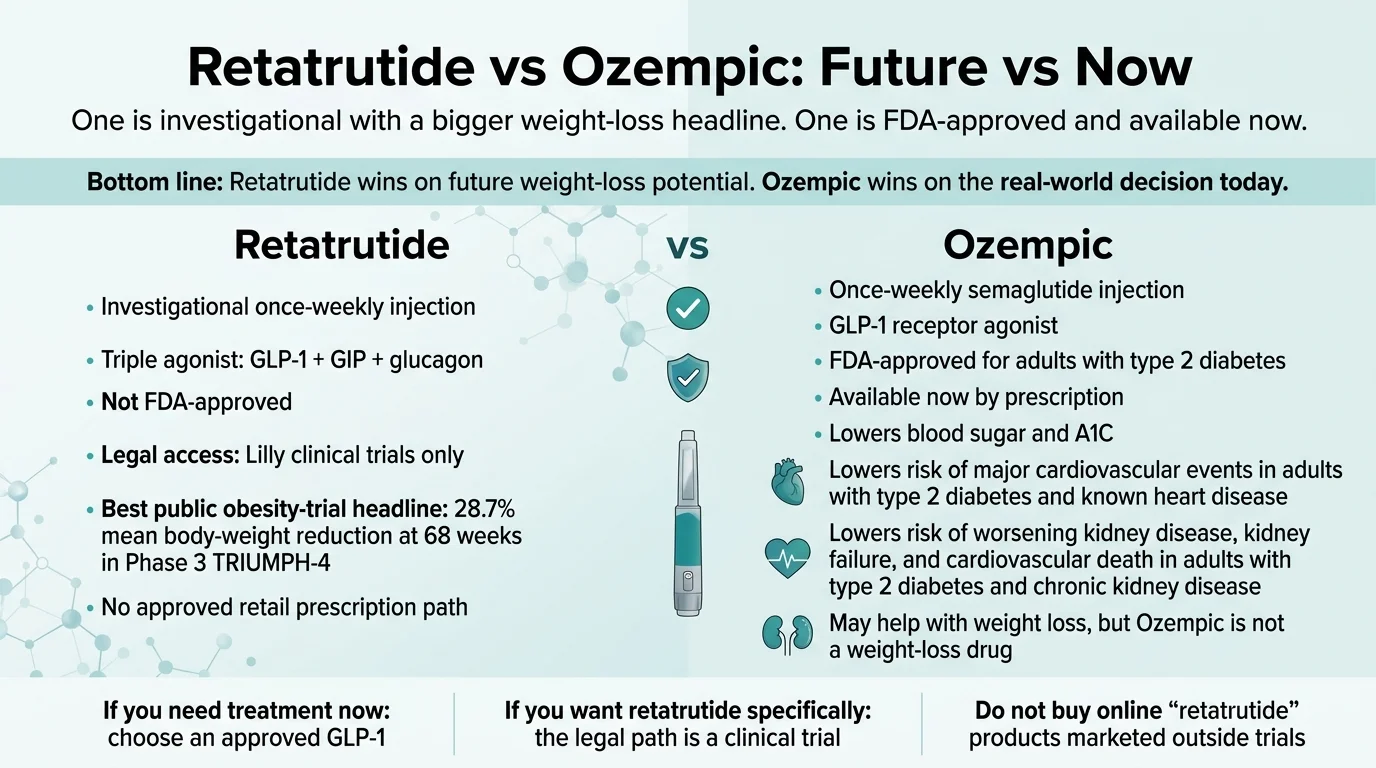 The one-line answer: Retatrutide probably wins on raw future weight-loss potential. Ozempic wins on everything that matters to a real decision today — FDA approval, legal availability, defined dosing, official pricing, and labeled cardiovascular and kidney benefits in adults with type 2 diabetes.