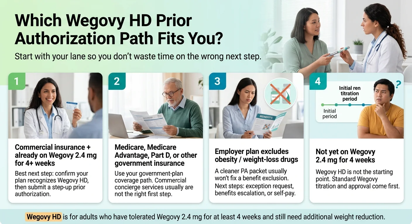 Wegovy HD prior authorization is usually harder than regular Wegovy approval — not because the medicine works differently, but because the 7.2 mg dose only launched nationwide on April 7, 2026, and most payer systems are still catching up. Even if your plan covered Wegovy 2.4 mg without a fight, it may not yet recognize the HD pen (NDC 0169-4572-14). NovoCare’s live coverage checker currently returns “no insurance coverage available for Wegovy injection 7.2 mg” for most plan lookups. At the same time, Oregon’s public drug list already lists “WEGOVY HD PEN INJCTR” as pharmacy-PA, and HCSC/Prime’s public summary explicitly names the 7.2 mg dose. Coverage is fragmented right now. The real question isn’t “Does my plan cover Wegovy?” It’s “Does my plan recognize this dose, under this indication, this week?”