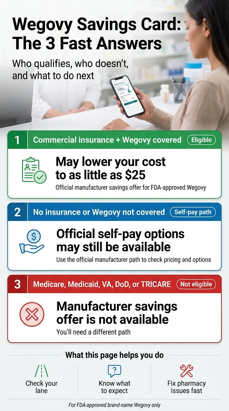 There are three Wegovy Savings Card eligibility lanes. Lane A is commercial insurance that covers Wegovy — you’ll pay as little as $25/month. Lane B is commercial insurance that doesn’t cover Wegovy, or you’re uninsured self-pay — you’ll pay a flat $149–$399/month based on dose and formulation. Lane C is government insurance (Medicare, Medicaid, VA, DoD, TRICARE) — the Savings Offer is not available to you at all, even if you offer to self-pay.