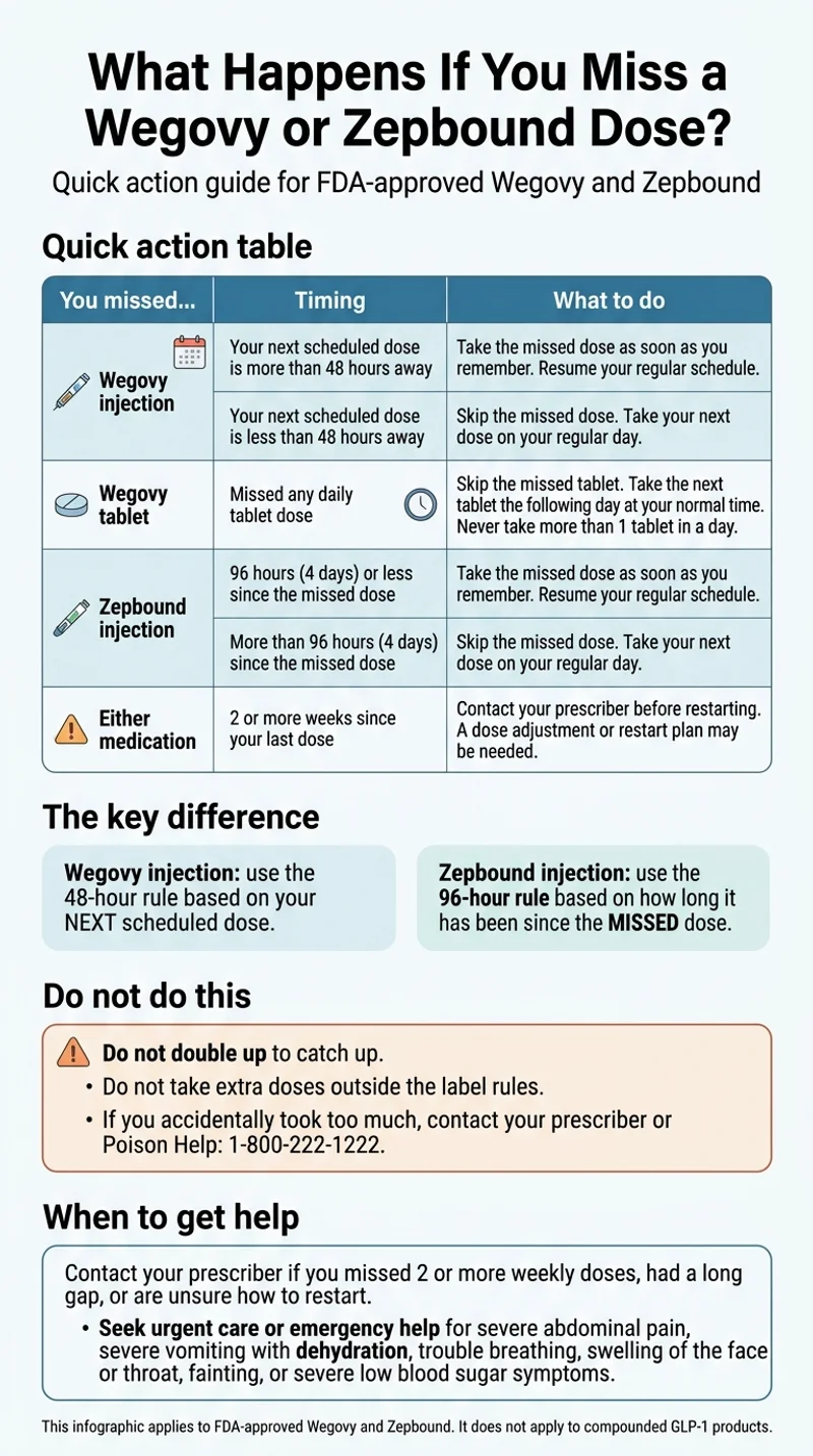 What happens if you miss a Wegovy or Zepbound dose depends on which drug you take and how many hours have passed. Wegovy injection uses a 48-hour rule based on your next scheduled dose. Zepbound uses a 96-hour rule based on the missed dose. Two different cutoffs for two different drugs. One missed weekly dose usually does not undo your progress. The mistake people actually make is doubling up to catch up — which is specifically what the rules are designed to prevent.