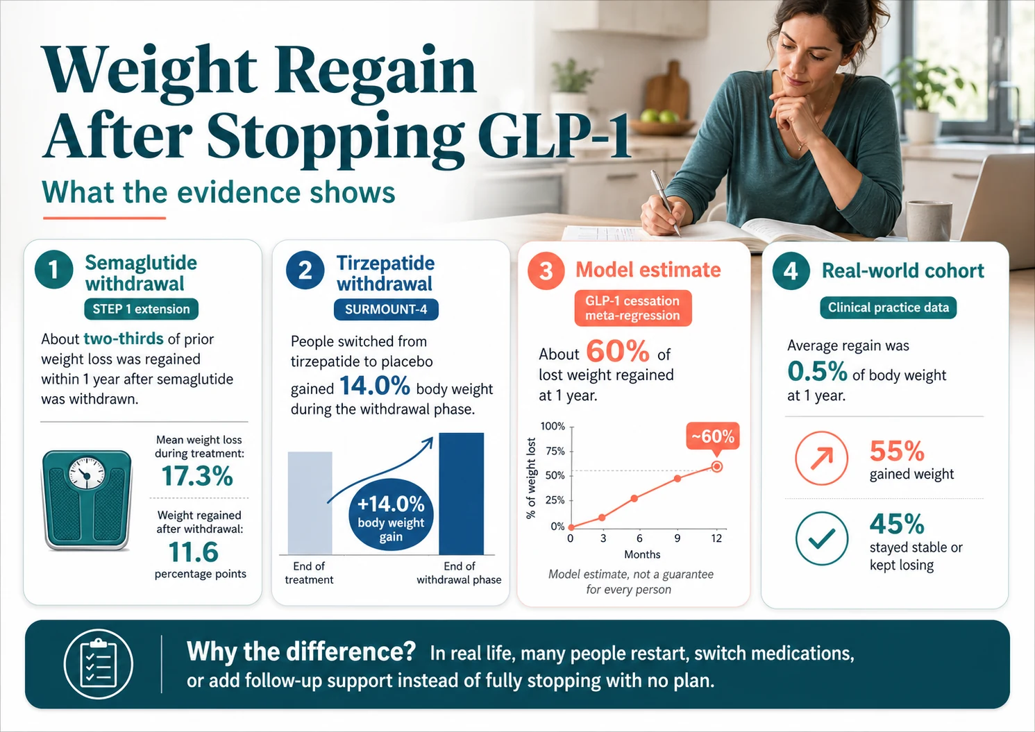 In the major withdrawal trials, participants who had semaglutide and lifestyle support discontinued regained about two-thirds of their lost weight within a year. People randomized off tirzepatide regained about 14 percentage points of body weight in the same window. A 2026 eClinicalMedicine meta-regression of GLP-1 cessation studies estimated 60% regain at week 52. Real-world cohorts look completely different: the Cleveland Clinic 2026 dataset (n=7,938) showed an average one-year regain of just 0.5%. Both are true. Both matter. The difference is what you do.