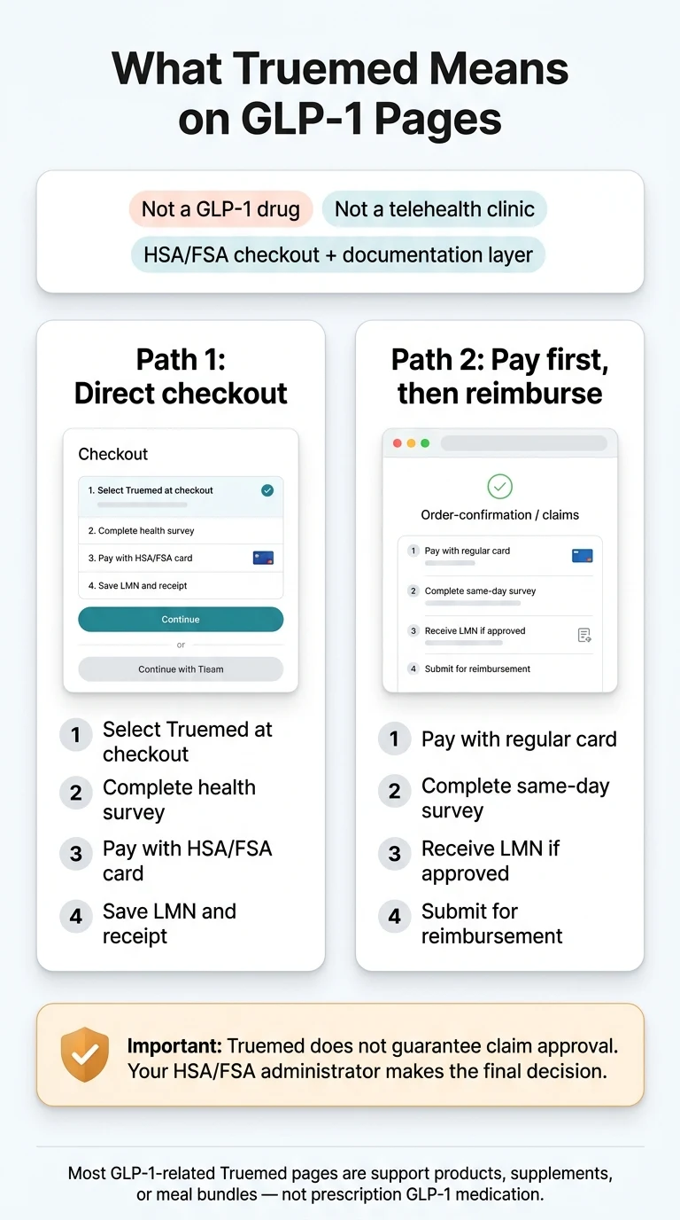 The fast answer: “Truemed GLP-1” is not a medication, not a telehealth clinic, and not a new weight-loss drug. Truemed is an HSA/FSA payment and documentation platform that shows up at checkout on certain GLP-1-related product pages — mostly supplements, companion products, coaching programs, and meal bundles aimed at people on GLP-1 medication.