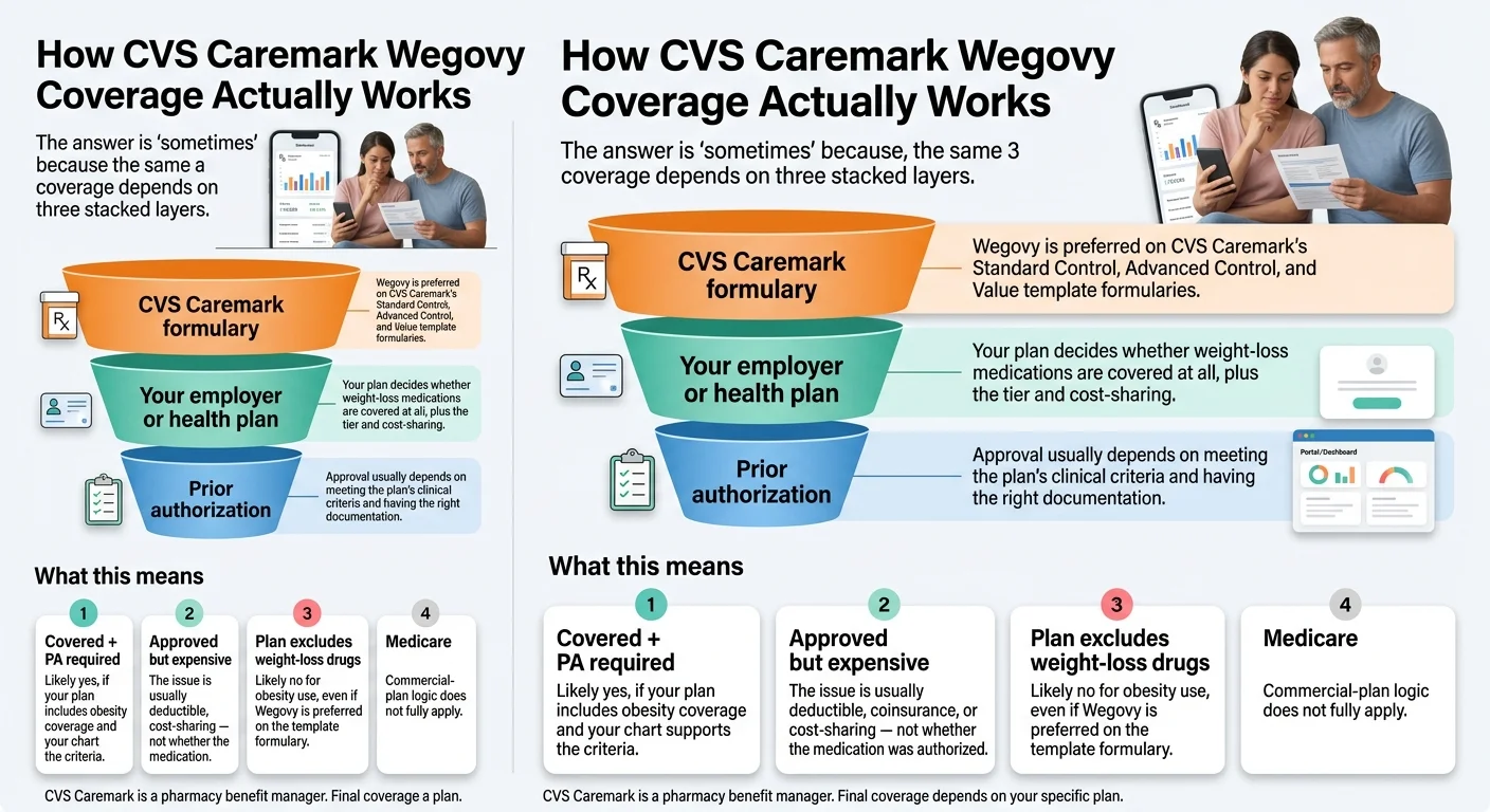 Short answer: sometimes. As of July 1, 2025, Wegovy is the preferred GLP-1 for weight loss on CVS Caremark’s Standard Control, Advanced Control, and Value template formularies, and it stays preferred through 2026.¹ But “preferred” is not the same as “covered on your plan.” Whether CVS Caremark covers Wegovy for you depends on three layers stacked on top of each other: the Caremark formulary, your employer’s benefit design, and your prior authorization outcome. Caremark has said about one-third of its employer-sponsored book of business has no weight-loss drug coverage at all.²