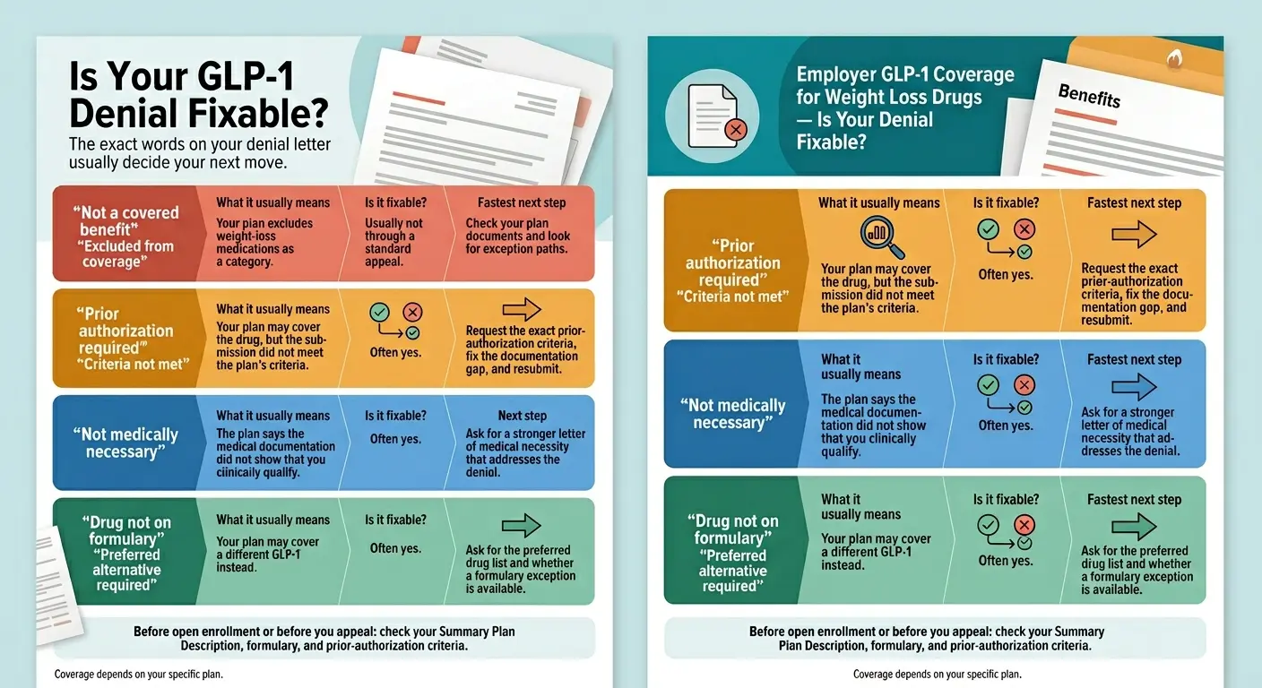 | “Drug not covered — try preferred alternative” | Formulary issue, not benefit exclusion. The plan covers GLP-1s but prefers a different brand. | Ask whether the preferred drug fits your situation. If not, request a formulary exception — a separate process from a standard appeal. |