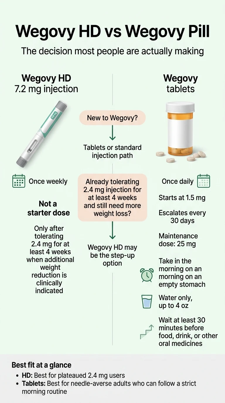 Bottom line up front: If you're searching Wegovy HD vs Wegovy pill, here’s the one thing almost every other page buries: Wegovy HD isn't a starter dose. The FDA label only allows HD (the new 7.2 mg weekly injection) after you've tolerated the standard 2.4 mg Wegovy injection for at least 4 weeks. So if you're new to Wegovy, you're not choosing between HD and the pill — you're choosing between the Wegovy tablet path (starts at 1.5 mg daily, titrates up to 25 mg over about 3 months) and the Wegovy injection path (starts at 0.25 mg weekly, titrates up to 2.4 mg over about 4 months). HD is the step-up option you graduate into later, only if clinically indicated.